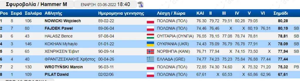 Έστειλε στη σφύρα στα 77,44μ. για να πλησιάσει το ατομικό του ρεκόρ και να δείξει σταθερότητα σε μεγάλες προσπάθειες. Ο Φραντζεσκάκης είχε ακόμη βολές στα 74,77μ., 74,23μ., 75,23μ., 75,84μ., 76,88μ. σε έναν αγώνα, όπου καθώς περνούσε η ώρα έβρισκε το δρόμο για μεγαλύτερες προσπάθειες. Ο Φραντζεσκάκης θα συνεχίσει τους αγώνες του σε δύο ημέρες στο Χορζόφ.